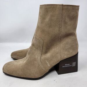 A squared-off toe and stacked block heel balance a versatile bootie rendered in waterproof suede designed to protect against the elements. They are a women's size 6.