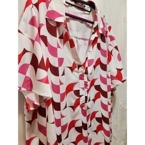BLOOMCHIC WOMENS 26 4X WHITE PINK BLOUSE GEOMETRIC RETRO V-NECK STYLISH ABSTRACT