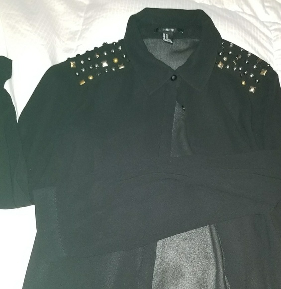 Sheer material black Forever 21 top with beautiful rhine stones on shoulder blades of the blouse.