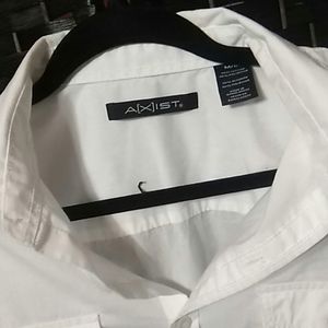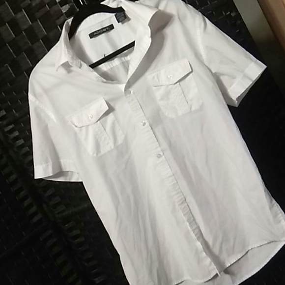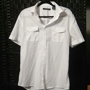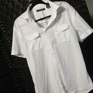 WHITE BUTTON DOWN SHIRT SLEEVE BLOUSE WITH POCKETS.