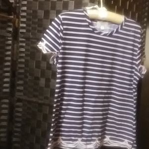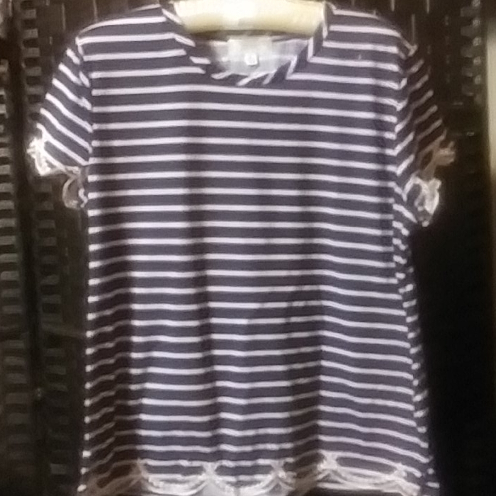 NAUTICAL BLUE AND WHITE BLOUSE WITH SCALLOP TRIMMING ON SLEEVES AND BLOUSE ENDING.