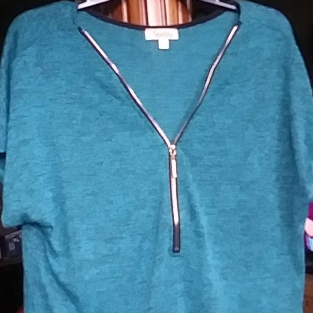 AQUA PULLOVER BLOUSE WITH SILVER RHINESTONE EMBELISH ZIPPER.