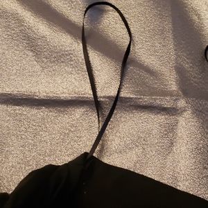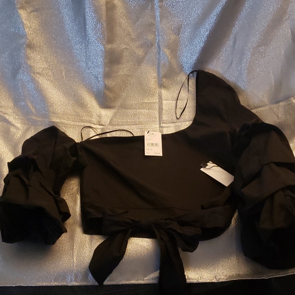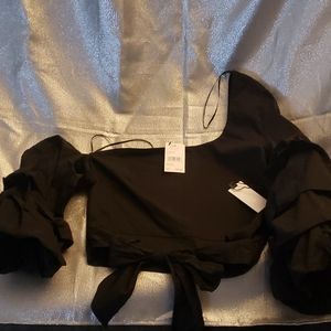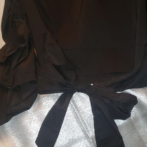 Black Blouse, cropped length, bow at waist, pleated pouf 3/4 sleeves, one bare shoulder. Super sexy dressy styling. Size Medium