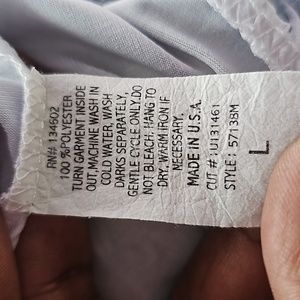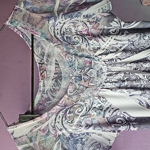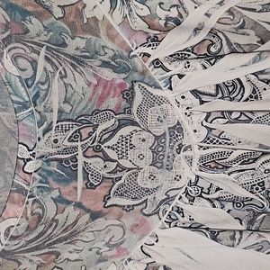 Capped sleeves. Roomy and casual.. Mostly grey with hints of purple, green and blue. Ruffled hem.
