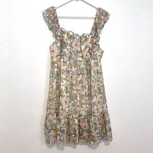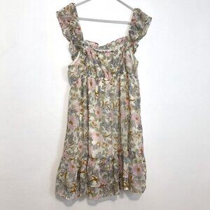 ◇ size large (may be juniors, unsure). Cream ivory / light green pastel green / light pink baby pink / blue / periwinkle purple ish blue ish / mustard and/or golden ish / brown / multi multicolor floral print. Smocked gathered stretch elastic trim on neckline and straps. Tiered ruffle trim. Lined (other than on straps; lining is slightly shorter than dress). Pullover. Square neck ish and sleeveless. Short mini length babydoll dress and/or fit & flare dress / sundress sun dress