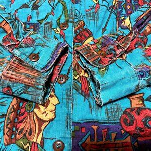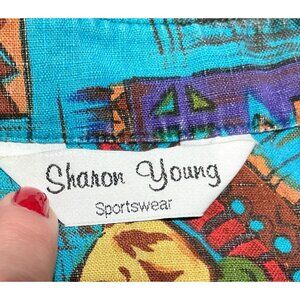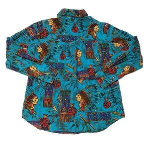 BLUE AMERICAN INDIAN SHIRT SZ L ALL OVER PRINT SOUTHWESTERN SHARON YOUNG WOMENS