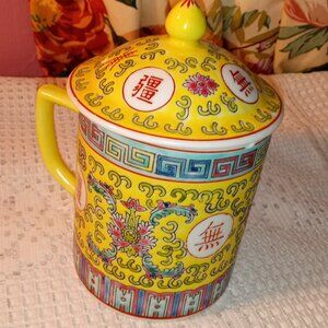 BEAUTIFUL BLUE AND YELLOW COLORFUL ORIENTAL DECOR TEACUP WITH MATCHING LID. GOOD CONDITION!
