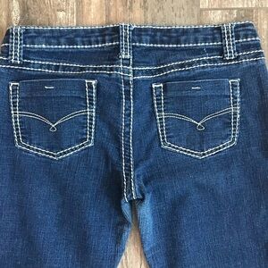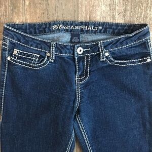 Blue Asphalt heavy stitch stretch denim jeans size 11. Gently used with minor wear at back hem. 79% cotton, 19% polyester, 2% spandex.