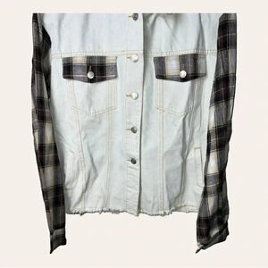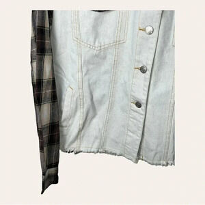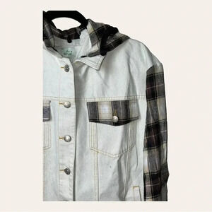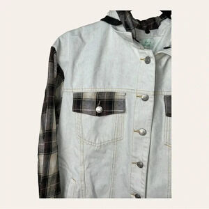 BLUE BUTTERCUP WHITE DENIM JEAN JACKET WITH HOOD PLAID PATTERN MATERIAL ON ARMS