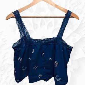 Simple and one of a kind cropped cotton camisole with 6” lace straps. It is a simple blue cropped style cami with sweet butterflies that cover the cotton top.
