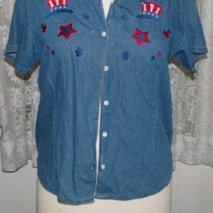 Excellent Condition on this lovely Ladies short sleeve shirt, Size Large Misses. It is 100% Cotton Lightweight Denim, smooth & soft. White buttons up the front and Red white & blue embroidery on both sides of the bodice front. Also has crystals on front. The measurements are: