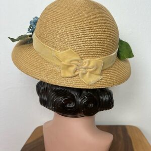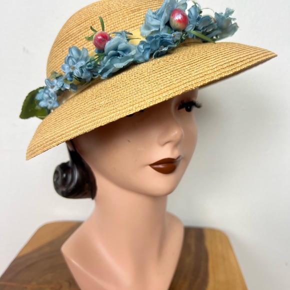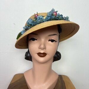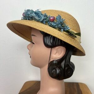 This reminds me of Italian Summers and Sundresses! Soooo cute with fluffy, blue florals, green leaves and juicy, little berries! A black elastic is great for under the chin or behind your head and under your hair. A cream, crushed velvet bow proves to be the perfect hat band. The interior boasts cream, grosgrain ribbon and a tag marked MSC 21. The hat is slightly domed with a saucer brim. Natural colored straw is perfectly woven!