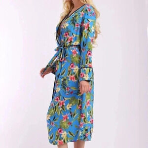 BLUE FLORAL DUSTER CAN BE WORN CLOSED WITH BELT OR LEFT OPEN 100% POLYESTER