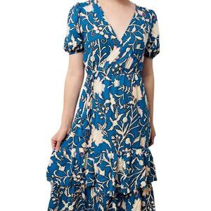 BLUE FLORAL RUFFLED WRAP MIDI DRESS BOHO CHIC SHORT SLEEVE SZ M TRENDY