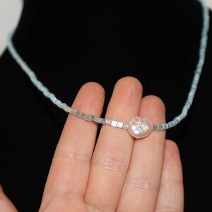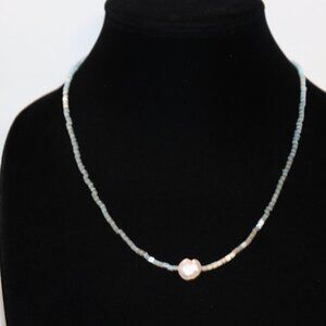 🌊🔹🤍 BLUE GLASS BEADED NECKLACE · NATURAL PEARL TOGGLE · 19.5"