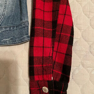 BLUE JEAN JACKET~RED PLAID ARMS~NWOT~SIZE S
