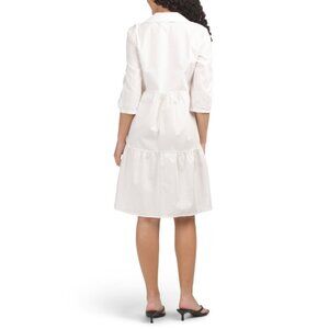 half button front, roll tab sleeve, embroidered details, shirt dress design, tiered skirt