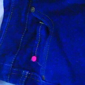 BLUE PAJAMA JEANS. LINED. POLESTER, COTON, SPANDEX FABRICS. SIZE LG.. PULL ON WITH DRAW STRING WAIST. BLUE WITH GOLD COLORED THREAD STITCHING AND ONE PINK BRAD BUTTON ON THE RIGHT POCKET. 2 HIP POCKETS AND 2 FRONT POCKETS WITH A RIGHT SIDE WATCH POCKET. INSEAM 33. WAIST 36.