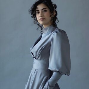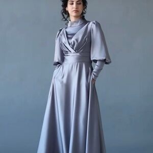 BLUE PUFF SLEEVE MODEST BALL GOWN