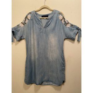BLUE RAIN Dress Sand Washed Look Chambray Embroidered Cold Shoulder Pockets Med
