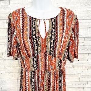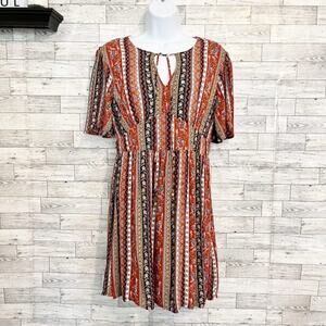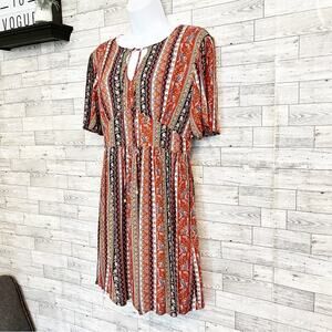 Featuring a charming V-neck with a self-tie detail and short bell sleeves, this dress exudes playfulness and femininity. The vertical floral and geometric print adds a unique touch.