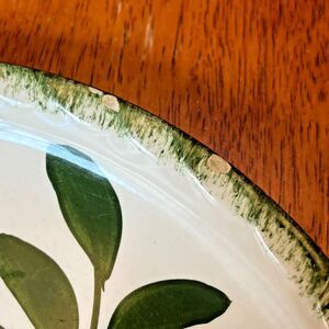 There are no cracks or crazing but there are several chips in the green sponge paint areas on the rim. There is also one chip on the back. Above the light green flower to the left of center there is a defect in painted area. On the back they are some of the typical pottery faults common in pottery from this maker and the era, including a few paint streaks under the glaze. All issues are shown in the photos.