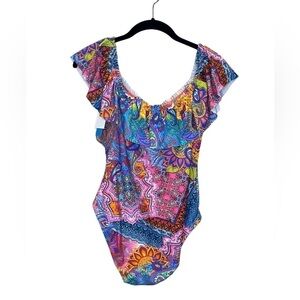 BLUE ROD BEATTIE Multicolor Paisley Ruffle Off the Shoulder One Piece Swimsuit