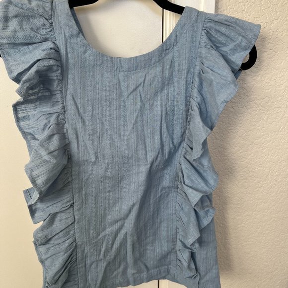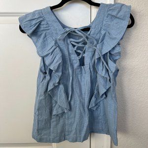 Lightweight, light blue top with ruffled edges. Criss-cross into a tie on the back. Not cropped, super adorable