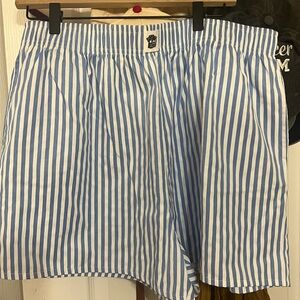 Our amazing boxer shorts are TTS with an elastic waist band and pockets. Waist band is stretchy but the legs of the shorts do not have stretch.