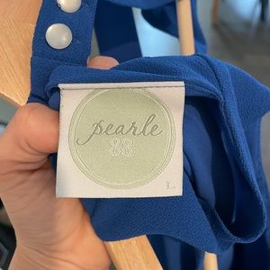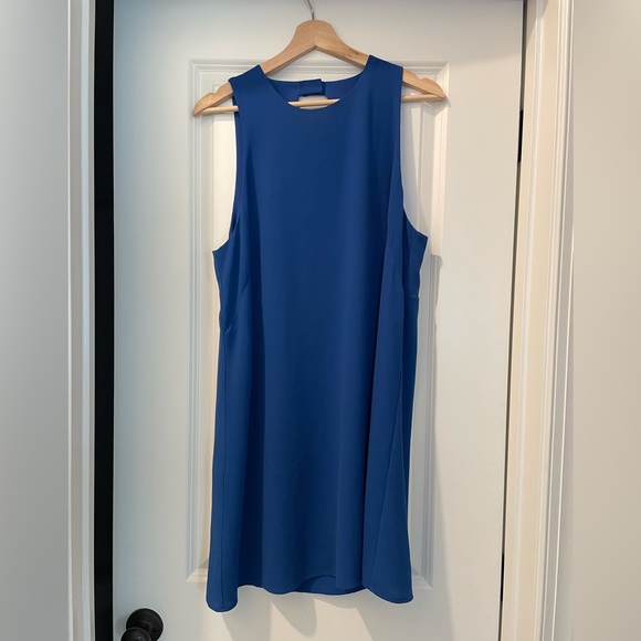 Solid blue dress , very breezy and comfortable . Cutout in the back. Falls above the knee