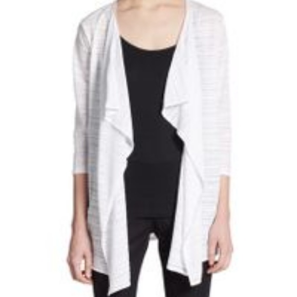 This lightweight knit cardigan is perfect for cool summer nights. It features a burnout stripe pattern. This listing is for the BLUE cardigan, the white is for fit reference only. This flowy cardigan has a waterfall/shawl style collar-- no buttons and 3/4 length sleeves. EUC.