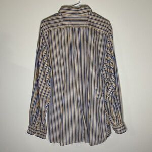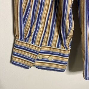 Blue, tan and white striped 100% cotton; one front pocket; 7 front buttons; two inside replacement buttons; three wrist buttons; 25.5” sleeves (shoulder seam-to-wrist); 32” back of the neck-to-bottom; 24” pit-to-pit measurement
