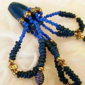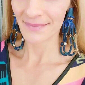 Eye catching and color popping handmade dangling Blue toned earrings. 4 looping rows hand cut wood beads and different color beads. So unique.