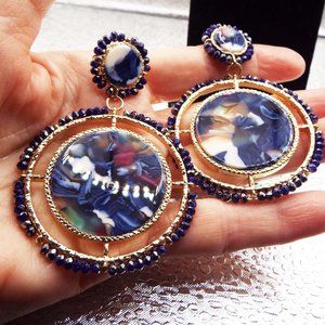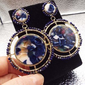 BLUE TORTOISE SHELL LUCITE CIRCLES & SEED BEAD LONG EARRINGS