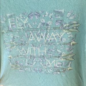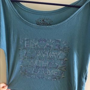 TEAL BLUE O'NEILL TEE. SAYS "FLY AWAY WITH ME" no rips or stains! Very cute and great for back to school. Does not fit tight, has more of a flowy fit. LEMME KNOW IF YOU HAVE ANY QUESTIONS :)