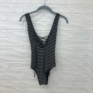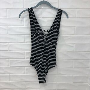 Body by Blue Life's Lace Up Bodysuit features a form fitting stretch fabric with ribbed contrast & stripe pattern, and lace up neckline