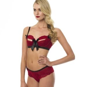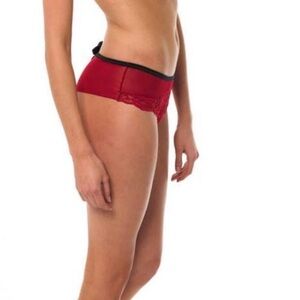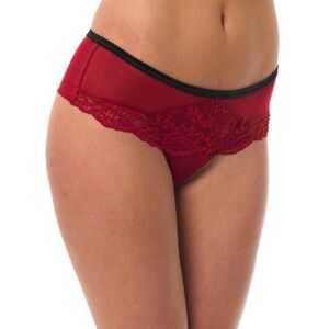 BLUEBELLA Eloise Brazilian Black Satin Bows Red Chiffon & Lace Thong Panties NEW . US Large . They are extremely stretchy . The matching bra is listed separately.