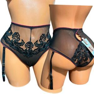 BLUEBELLA Mara High Waist Suspender Brief mesh Floral Appliqué Garter Black S