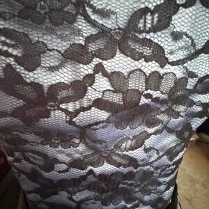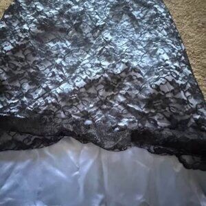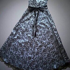 This playful and elegant strapless dress boasts a delicate black lace overlay with a soft light blue lining for a charming look. Crafted to flatter, it features a 26-inch waist, 28-inch bust, and measures 40 inches in length for a party-ready fit. The back ribbon ties into a sweet bow, adding a flirty touch. Previously owned with the tag removed, this size small dress blends classic elegance with fun style, perfect for turning heads at any celebration.
