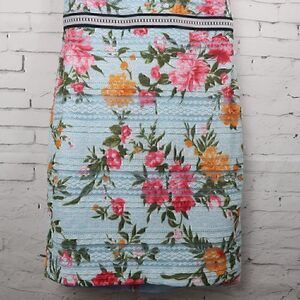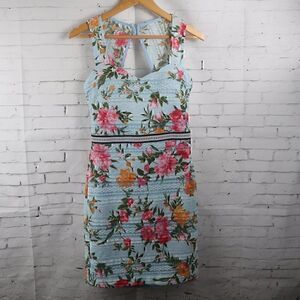 BLUE FLORAL SLEEVLESS LACE OVERLAY MIDI WEDDING EVENT PARTY DRESS BUILT IN PADDING SIZE MEDIUM PRE OWNED NO FLAWS