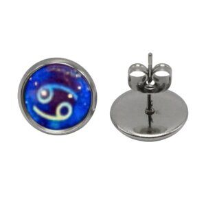 Beautiful glass cabochon stud earrings featuring royal blue zodiac signs. These must have accessories are constructed of silver plated metal posts, topped with glass cabochons. Earrings are completed with soft silicone backings for a secure fit. The earrings measure 12mm in diameter. Remember, we always include a free gift with each purchase!