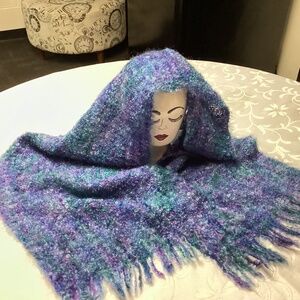 This is blue and purple is very soft almost like a soft MOHAIR. Lovely not scratchy rather soft non smokers no let home length is at 70 inβ width is at. 14 in just the best colors for any outfit !!!ππ