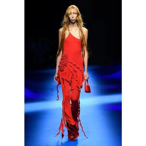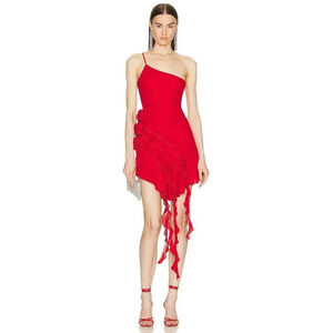 Drawing inspiration from both Salsa dance and the wildly popular stretchy party dresses of the early Noughties, this asymmetric frilled mini dress will steal the attention of any room. It's adorned with carefully placed fabric rosettes, with cascading frills creating a mesmerising trail of red as you stride confidently throughout the night.