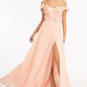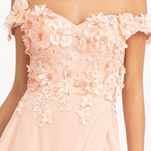 Off-shoulder dress with flower embellishment is utterly elegant! This beautiful chiffon A-line dress features sweetheart neckline with off-shoulder, open corset back, and side leg slit. 3-D floral appliques and delicate embroidery creates an graceful effect.