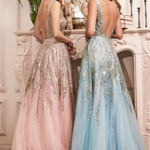 Dance the night away in this layered tulle ball gown. Shimmering glitter and bead embellishment adorn this gown from bodice to skirt. Styled with a deep plunging neckline, open back and illusion cut out sides.
