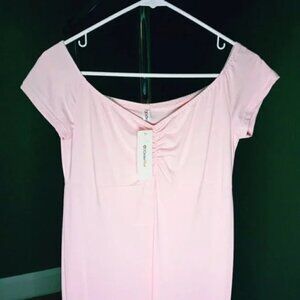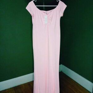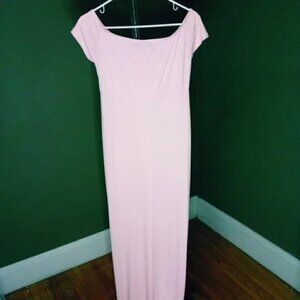 Off the shoulder maxi dress with cute scrunched look on top. Can be worn on or off the shoulders. Light pink color. Brand new with tags, never worn. Perfect for a wedding, baby shower or other events. Dress is long and can have a small train depending on your height. OC Order Plus brand.