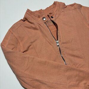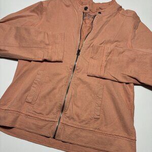 Super cute minimalist utility jacket, featuring a stand collar, structured fit, neutral aesthetic, slightly edgy, everyday essential! To my personal eye, the color of this piece is a bit more light pink in person - pictures give it a darker clay color / muted pink.