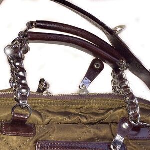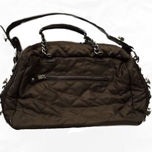 BEAUTIFUL BLVD BAG, BODY QUILTED NYLON WITH LEATHER AND CHROME CHAIN ACCENTS, NEW NEVER USED. THIS IS A BIG BAG MEASURES 13" ACROSS, 9" HIGH AND 5" WIDE, IT HAS A SHOULDER STRAP AS WELL AND CHAIN HANDLES. TINY POCKET IN FRONT ANOTHER IN BACK, BOTH ZIPPERED, 1MORE ZIPPERED INSIDE AND 2 SLIDE POCKETS, REALLY FINE QUALITY BAG, GREAT FOR TRAVEL OR WORK. SLEEP BAG INCLUDED.