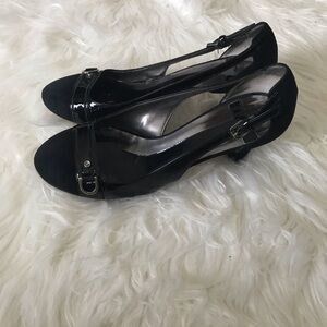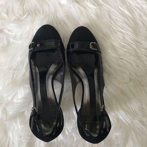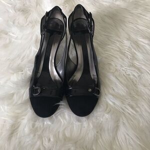 Beautiful pumps with rounded toe. Suede and patent leather with buckle detail on top.