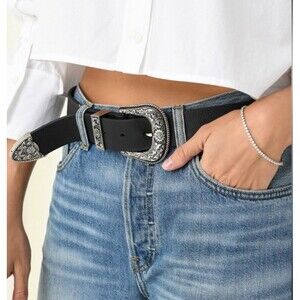 B-Low The Belt Black Leather Frank Belt. Super soft leather and western like silver metal hardware. Dize large with the width being 1 1/2 and approximate measurements of length is from top of buckle to first hole 37 1/2 inches and to last hole is 41 1/2 inches. This is a brand new belt so leather and metal has no wear at all but it is missing the silver metal point. Comes from a smoke-free home. Retail cost $138